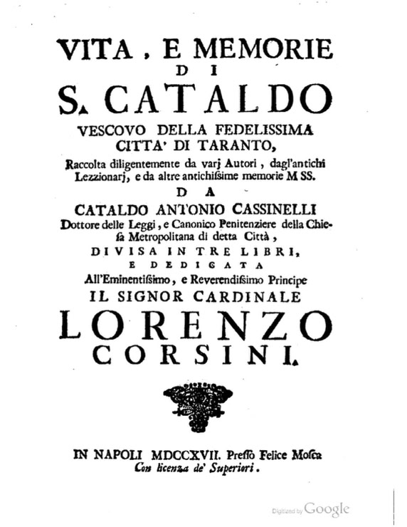 Esaurita da tempo la prima edizione della Vita (breve) di S.Cataldo, accogliendo le insistenti richiesti richieste degli amici, licenzio per le stampe il presente lavoro, che si differenzia dal precedente per l’apparato critico e per una maggior copia di notizie.